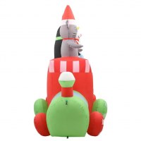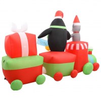 Dette oppustelige tog er lavet af stof og er let, vejrbestandigt, vandtæt og holdbart. På toget sidder en mus og en pingvin, begge med festlige nissehuer på. Pingvinen holder et Merry Christmas-skilt og spreder hyggelig julestemning. Dekorationen kan oppuste sig selv på få sekunder, hvilket er særdeles praktisk. Der er en blæser indbygget i den oppustelige dekoration for at holde produktet fyldt med luft. Denne pingvin-dekoration er også let at opbevare til næste jul, når den er tømt for luft. Dekorationen er udstyret med 3 LED'er, der udsender et klart lys, og er meget energieffektiv. Jordspyd og reb medfølger til at fastgøre toget.